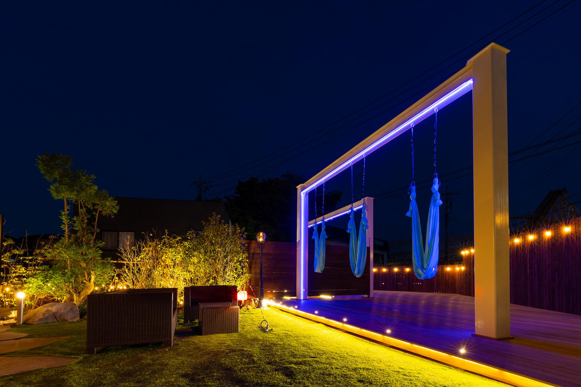 プライベートヴィラ内には、大型トランポリン、スラックライン、エアリアルヨガなど、多彩なアクティビティをご用意しております。観光に出かけなくても、施設内で充実した楽しい時間をお過ごしいただけます。